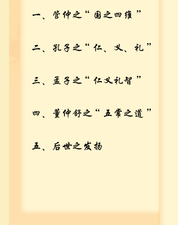 管仲认为“礼”就是不能越出应有的节度,即思想行为不能超出道德规范;“义”,就是自己不推荐自己,即使自己的思想行为符合道德标准;“廉”,就是不隐瞒自己的缺点错误,即廉洁不贪;“耻”就是不与不正派的人在一起,即要知羞耻。他认为“礼、义、廉、耻”与法相比,比法更为重要,把它们认作支撑国家大厦的四根柱子。